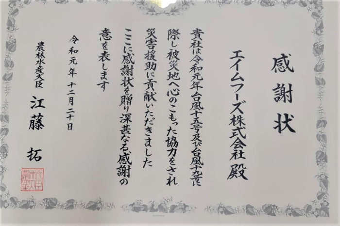 2019年度の台風15号、19号の台風被害によりエイムフーズ株式会社では千葉県を中心とした災害地域への避難場所へ当社